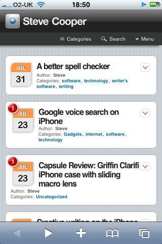 I have discovered an awesome plugin for wordpress called [wptouch](http://www.bravenewcode.com/wptouch) which is a skin for wordpress which only activates when you read from an iPhone. It makes a much cleaner interface for your blog, I think. Here’s the snapshot from safari;