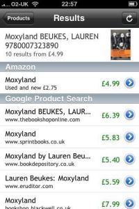 The app is extremely simple to use, and cheap, too. It can save you money in a purchase or two. I used it at Borders the other day, scanned a book, and found a copy six quid cheaper somewhere else online. Since the app costs less than two quid, it’s a great little moneysaver. It also acts as a nice ‘outboard memory,’ storing a list which can form a wishlist. Scan in books you want to remember, and it’ll keep the list and let you email it off.